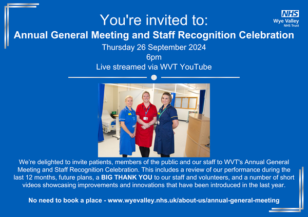 Members of the public, patients, staff and volunteers are invited to attend Wye Valley NHS Trust’s virtual Annual General Meeting (AGM) from the comfort of their own homes, which is taking place on Thursday 26 September at 6pm.